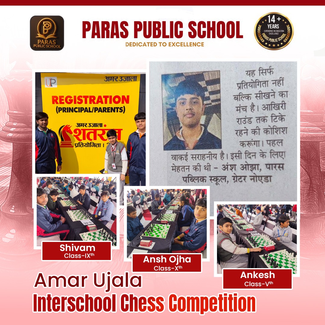 We are proud to share the wonderful performance of our students at the 📰 Amar Ujala Interschool Chess Competition. Our young champions showcased strategy, focus, and determination on the board 👏♟️ 🏆 Congratulations to our participants: 🔹 Shivam – Class IX 🔹 Ansh Ojha – Class X 🔹 Ankesh – Class V Your dedication and sportsmanship truly reflect the spirit of Paras Public School – Dedicated to Excellence 🌟 Keep thinking. Keep learning. Keep winning! ♟️🔥